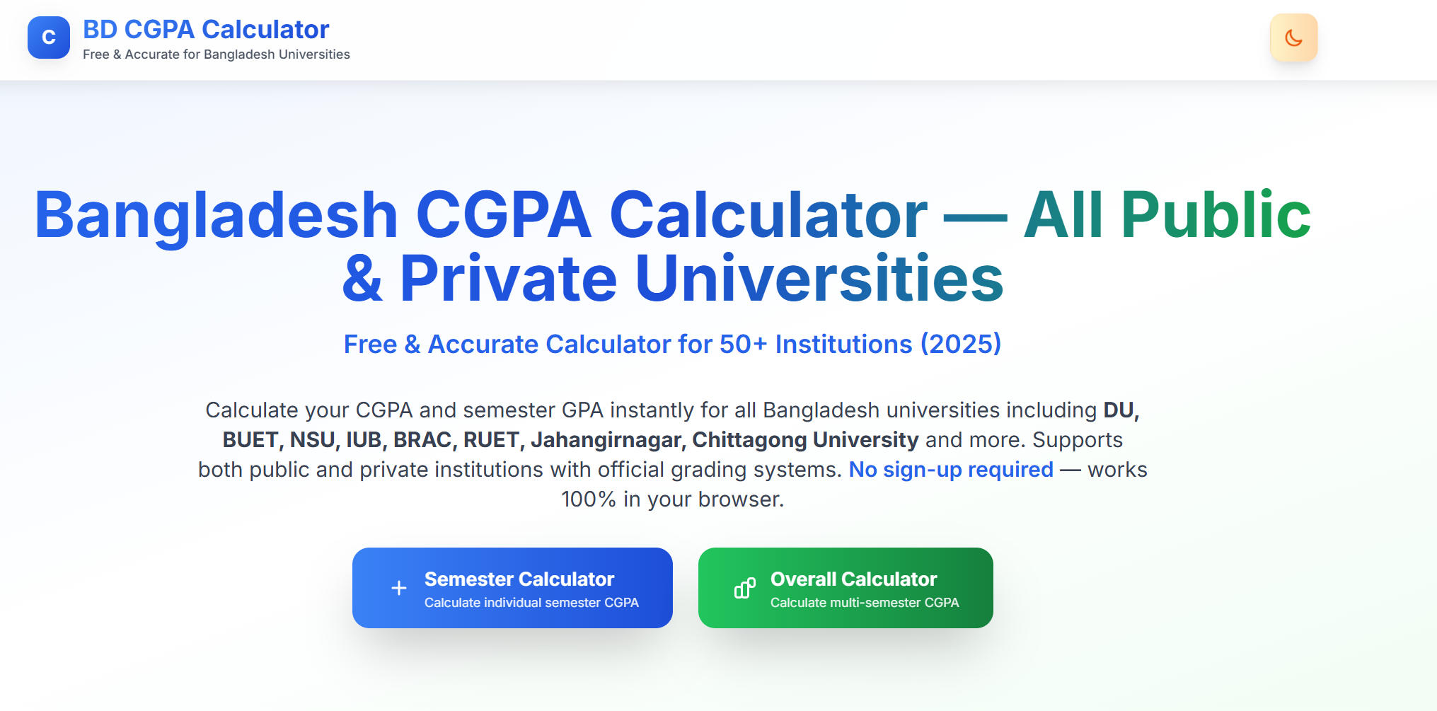 Free CGPA & GPA Calculator for all Bangladesh universities - DU, BUET, NSU, IUB, BRAC, RUET, Jahangirnagar, Chittagong, and more. Instant calculation for public and private institutions. No signup required.